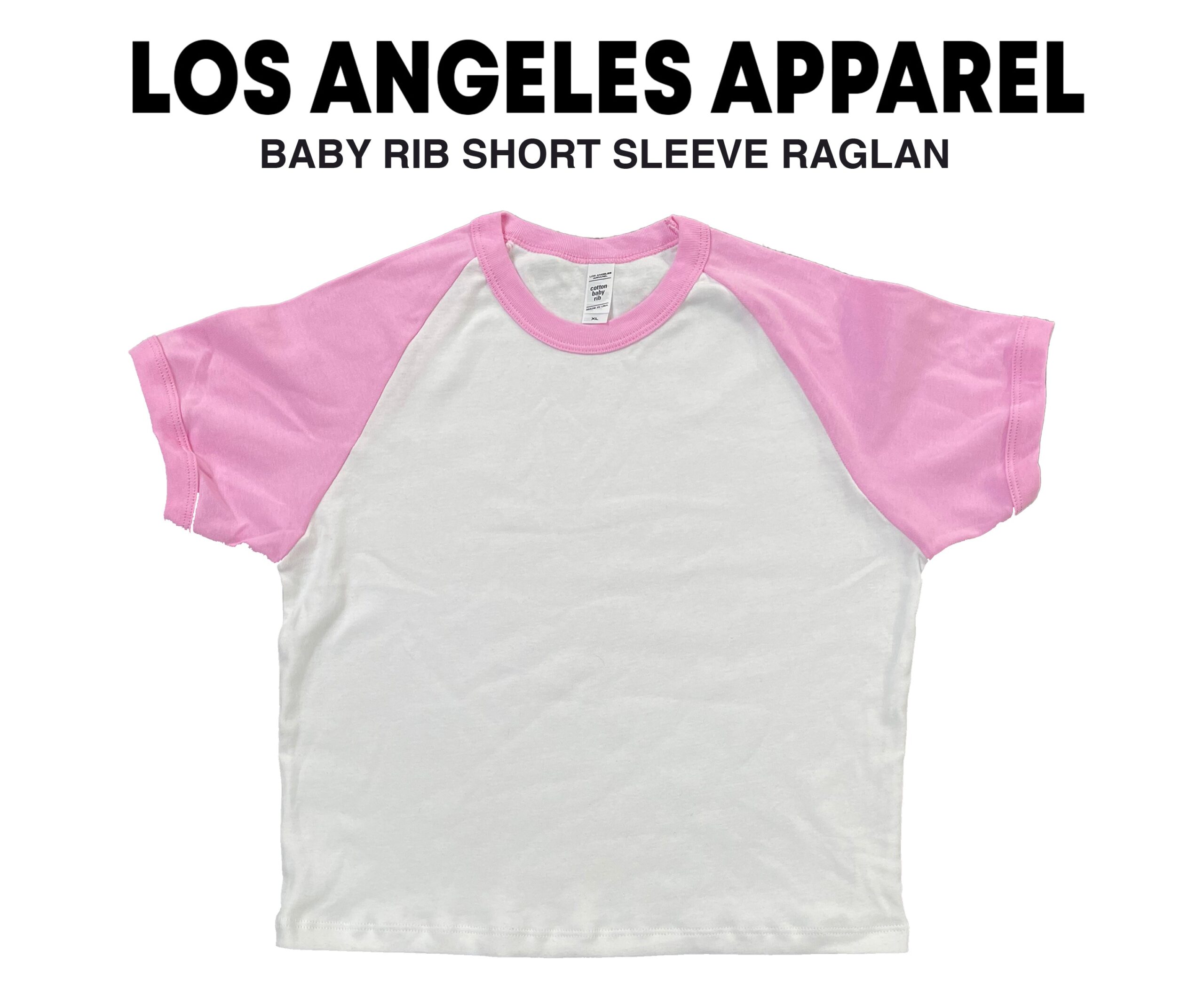 A cropped baby tee with contrasting raglan sleeves and a 3/4 binding finish. Combed cotton baby rib made of soft 30 singles yarn. Made in USA.